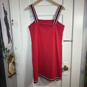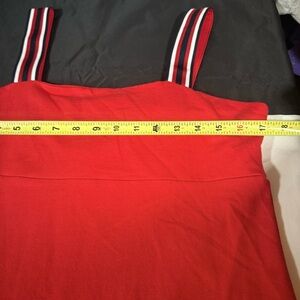 Chic red dress with striped straps. Perfect for casual outings. Comfortable and stylish.