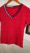 Vibrant red tee with black dot pattern. Features a stylish striped V-neck. Ideal for casual wear.
