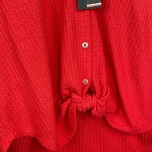 Chili red sweater. Tie-front, waffle-knit construction. Classic, preppy style. Button front closure. V-neck. Long sleeves, drop shoulders. Style J9KH0589