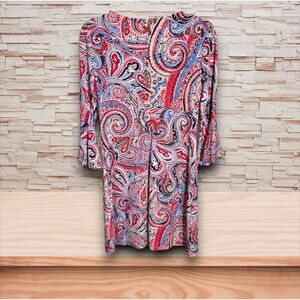 Elegant midi dress with vibrant paisley pattern. Features red and blue hues. Perfect for any occasion.