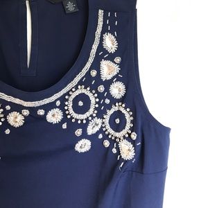 Never worn! This tank top is embroidered with different silver beads, none of which have came loose! In very good condition, never been worn and has been kept hanging in a closet. The closure is a silver studded button at the top of the neck in the back. Material is 100% polyester with some stretch! Sewn-in store security tag still attached.