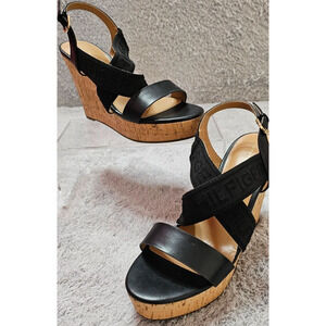 Tommy Hilfiger Sandals Womens 7.5M Keiko Black Logo Strappy Woven Wedges