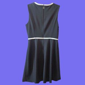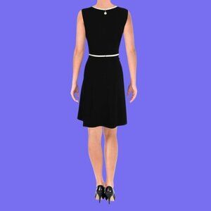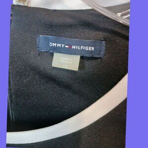 Tommy Hilfiger Scuba Crepe Bow tie fit This sleeveless fit and flare dress in black with white accents offers a timeless, elegant design suitable for formal or professional is like new from smoke and pet free home.