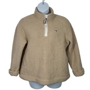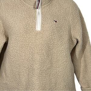Tommy Hilfiger Sherpa Pullover Teddy Jacket in tan, size XL. This cozy jacket is in excellent pre-owned condition and comes from a smoke-free home.