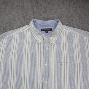 Tommy Hilfiger Shirt Mens 2XL Blue White Striped Linen Blend Short Sleeve Button