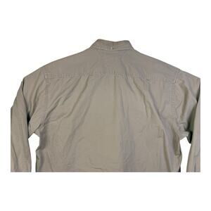The product is a vintage Tommy Hilfiger men's button-down shirt in khaki color, size medium. It features a solid pattern, long sleeves, a collared neckline with button-down style, made of cotton fabric. Perfect for casual occasions, travel, or all seasons, this shirt is machine washable and has a regular fit. With its designer theme and classic preppy style, this streetwear Y2K piece offers ease of care and timeless appeal.