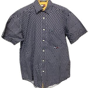 Tommy Hilfiger Men’s Short Sleeve Button Up Shirt. Size Small. Color Navy Blue and White Stars. Please reference attached pictures for colors, condition,pattern,care instructions and approximate sizing.