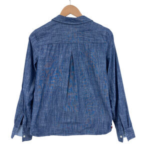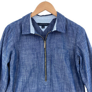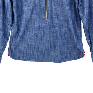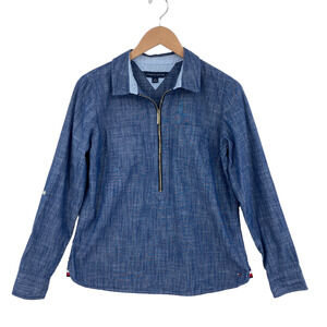 Tommy Hilfiger Shirt Women Small Blue Chambray Long Sleeve Logo Half Zip Popover