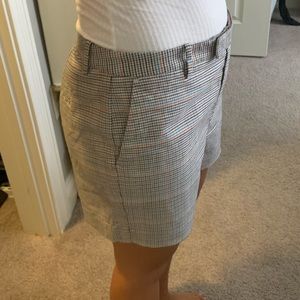 Tommy Hilfiger shorts size 8. Houndstooth pattern with grey, cream, blue, orange, and navy colors. Two pockets at the front and two pockets (still sealed) on the back.