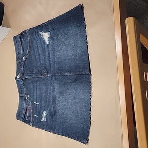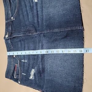 Tommy Hilfiger Size 12 / 31 Distressed Denim Mini Skirt, NWOT. Never Worn. Factory Distressing, otherwise no holes, rips, stains or snags. Please refer to measurements in photos to ensure proper fit.