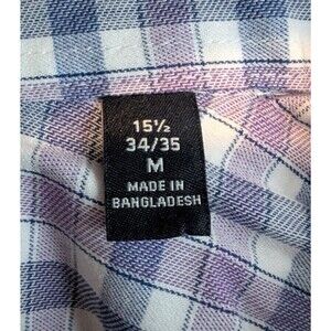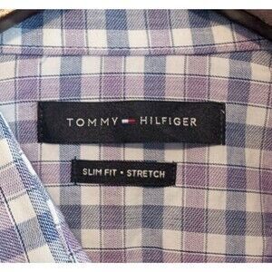 Long sleeve button up dress shirt from Tommy Hilfiger. Size 15 1/2 34/35 Medium. Purple check slim fit top. Made of 97% cotton and 3% elastane. Excellent pre-owned condition. It is about 29" long and 21" armpit to armpit. Buy with confidence. Your satisfaction is my priority. Ships fast and comes from a smoke-free home.