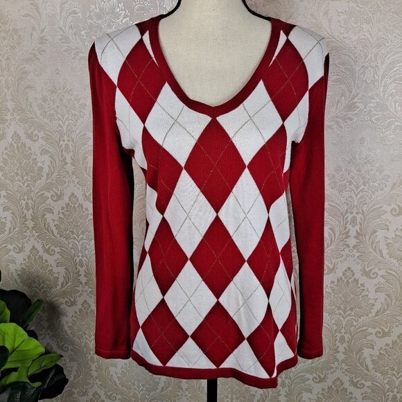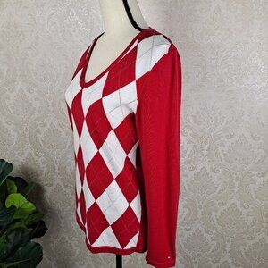Tommy Hilfiger Size Medium Red white Gold Argyle Front Sweater Long Sleeve VNeck