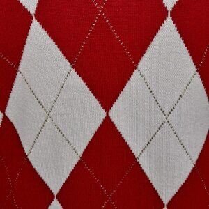 This long sleeve sweater has a fun argyle pattern on the front in red and white with a fine gold metallic stripe through it. Sleeves and back are a solid red. V-neck. Finely ribbed. Embroidered logo on left cuff.