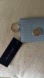 Chic sky blue card wallet. Features gold emblem. Perfect for everyday use.