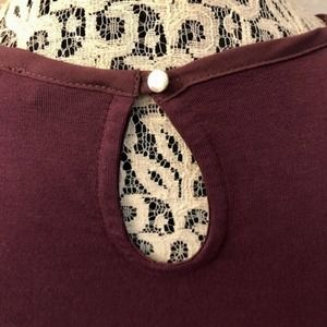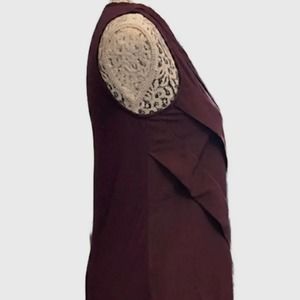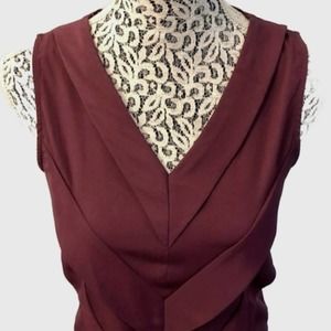 Tommy Hilfiger wine colored sleeveless blouse. It features a V-neckline, a chevron pattern down the front that is made of polyester and has a silky feel. The back is made is a soft stretchy material and has a cute keyhole button closure in the back of neck.