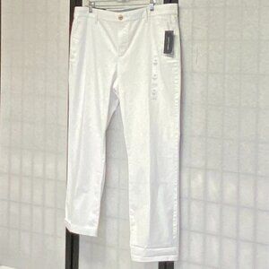 Classic and Versatile High-Rise Tapered Heritage Chino Cuffed Ankle Pants from Tommy Hilfiger. New with tags. Midweight cotton with hi rise slim silhouette in solid white. Flat front dress pants feature a straight leg and a relaxed slim hip and thigh. Belt-loop waistband with button and zip fastening. Functional front slant pockets and button welt pockets on back. Cuffed hem; can be lowered. Pair them with a crisp blouse or casual tee for timeless Tommy Hilfiger style!