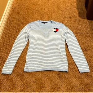 STUNNING Vintage Women's Authentic Baby Blue and White Pinstriped Long Sleeve Lightweight Knit Tommy Hilfiger Casual Top, Size Small. This is a Rare Piece That is Hard To Find, And Is Sooo Flattering and Cute! Features the Iconic Navy Blue & Red Embroidered Stitched Tommy Hilfiger Logo in a Heart Shape, and Has a Slight V Neck Shape. In Good Pre Owned Condition! So Iconic!