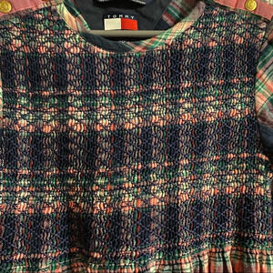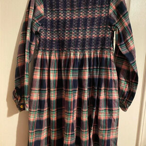 Beautiful pink and navy plaid with gold snaps on shoulders