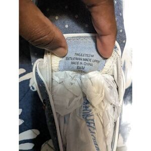 Tommy Hilfiger Slip on Sneaker Chambray polka dot size 8.5 Blue White Twlilette2-M gently used condition has slight orange spot on rubber noted in the photos.