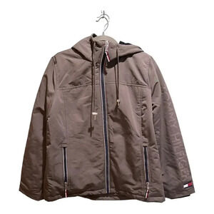Tommy Hilfiger softshell full zip hooded fleece lined jacket, size medium. Tommy Hilfiger name down the left arm and inside of the hood. Excellent preloved condition, no flaws noted.