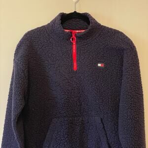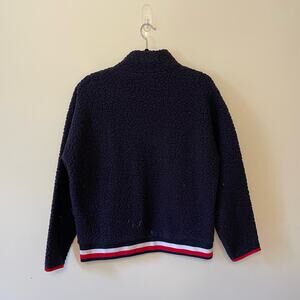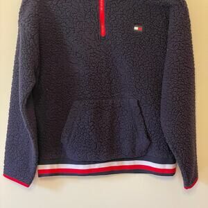 Details: long sleeve pullover sweater Tommy Hilfiger SPORT women’s medium fluffy cozy cabincore athleisure sporty stripe fluffy embroidered logo flag zipper closure turtleneck pocket athletic workout