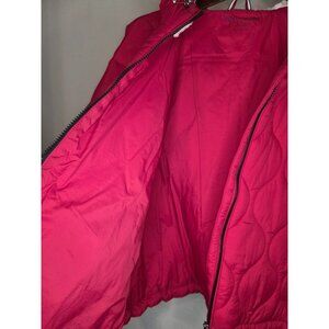 Stay warm and stylish with this Tommy Hilfiger Sport quilted hooded jacket in a vibrant red (almost a pink-red). Designed with a cozy white sherpa-lined hood, full zip closure, and quilted wave pattern for extra insulation. Features branded zipper pulls, adjustable hem toggles, and ribbed cuffs to lock in warmth.