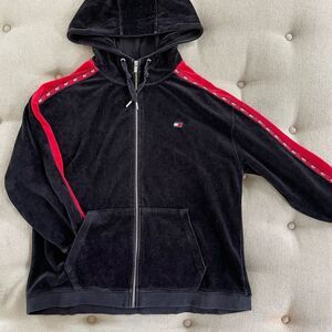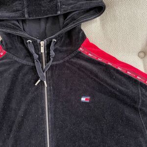 Tommy Hilfiger sport, two-piece tracksuit, including a fullzip hoodie and jogger style pants. Black velour, with red stripes across the shoulder and down the arm and down each leg. Part of that stripe includes branded Hilfiger logo and embroidered Hilfiger flag on the chest. Zipper pole, grommets and drawstring. Tabs are all logoed. Front pocket. Knit waist and Cuffs. Laying flat. The jacket measures 24 inches shoulder to hem and 23 inches armpit to armpit. the size on the jacket is 0X. The pants are 20 inches straight across the waist with a 12.5 inch rise and 27 inch inseam. The tag size on the pants is 1X. Cotton and polyester blend.