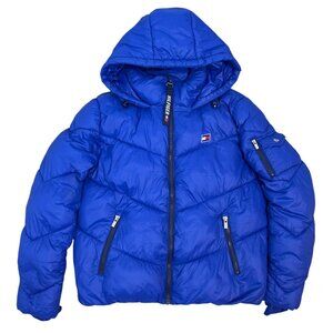 Tommy Hilfiger Sport Puffer Jacket Coat Women's S Chevron Quilted Hooded Aspen Blue Logo