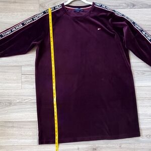 Tommy Hilfiger Sporty Velour Deep Purple (Auborgine) Tunic Dress, Scrumptiously Plush, Pull-Over, Round Neckline, Long Sleeves with Sporty Logo Tape Striping Down Arms, Deep Purple Color please see close-up photos for color accuracy with Navy Red and White Brand Tape Stripe Down Arms, 95% Polyester, 5% Elastane, So Soft! Perfect for Lounging or On the Go! Women's Size 1X, Excellent Used Condition, No Signs of Wear, Clean, Smoke-free Home, Approximate Measurements: 36" Shoulder to Hemline Length, 26" Armpit-Armpit, 28" Neck-Sleeve Length