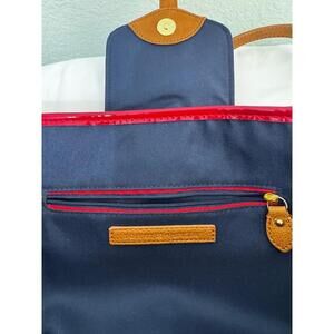 Classic Tommy Hilfiger striped canvas tote bag with rich brown leather trim and gold-tone logo accent. Features navy and cream nautical stripes, red piping detail, roomy interior with zip and slip pockets, and a secure magnetic closure. Perfect for everyday use, travel, or a coastal chic summer look Note the smudged edge visible in the last picture—untested for cleaning.