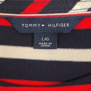 Stylish striped dress by Tommy Hilfiger. Features red, white, and blue stripes. Perfect for casual outings.