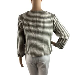 Tags: tommy hilfiger jacket, striped cotton blazer, boucle stripe jacket, navy and cream jacket, button front cotton jacket, prep style jacket, tommy hilfiger size 8, casual work blazer, woven texture jacket, lined lightweight jacket