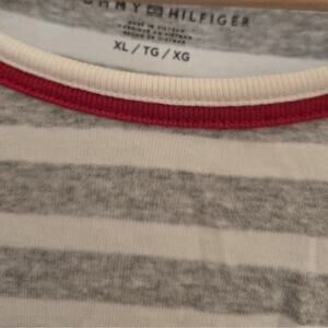 Keywords: Tommy Hilfiger stripe tee, gray and white nautical top, Hilfiger embroidered logo, XL striped shirt, women's Hilfiger t-shirt, casual nautical style, classic prep tee, contrast trim Hilfiger shirt