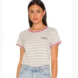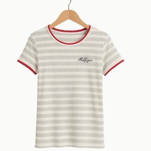 Nautical-inspired striped tee by Tommy Hilfiger featuring gray and white horizontal stripes with contrast red and white ribbed trim on the sleeves and collar. Signature “Hilfiger” embroidery at the chest adds a clean, classic touch. Lightweight cotton blend with a slightly fitted cut.