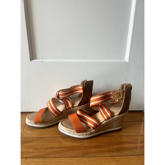 Super cute Tommy Hilfiger platform sandals with bold orange-and-white striped elastic straps. Easy velcro closures, cushioned footbed, and a lightweight espadrille-style platform. Perfect for summer, travel, or everyday wear.
