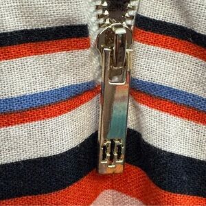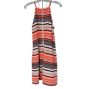 Tommy Hilfiger striped shift dress in size Small. Bold multi-color horizontal stripes in red, navy, cream, peach, and blue. Made from a linen-viscose blend that’s lightweight and breathable, perfect for warm-weather wear. Features an exposed back zipper and relaxed halter neckline.