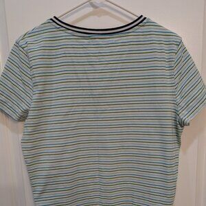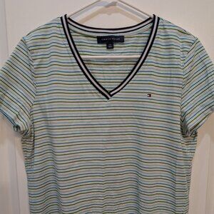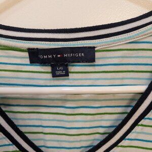 Stylish Tommy Hilfiger tees with classic stripes. Perfect for casual wear. 3-pack. non smoking and pet free home. the red and green shirt, like new. navy shirt has some sign of wear, no rips or stains.