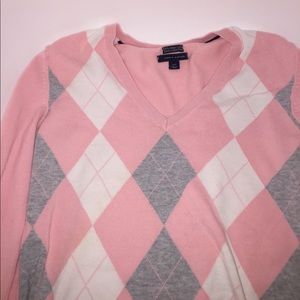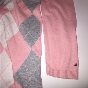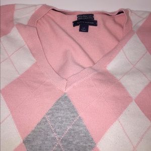This is a pink, white, and gray sweater that conforms to the body for a very put together and chic look. It is in perfect condition and has barely been worn.