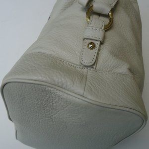 Tommy Hilfiger TH Logo Pebble Leather exterior Bowler Satchel /handbag.Off White.Navy blue fabric lining with inside zip, cellphone and multi-function pockets,exterior zip pocket. Gold tone hardware; signature center stripe detail.Zip-top closure;12-1/2" W x 11" H x 7" D.Handles 15"drop. Good pre owned conditions with no scuffs or scratches, odorless interior,There are a one of light spots on the handle pic.7.Please review all photos carefully to judge prior to purchasing.