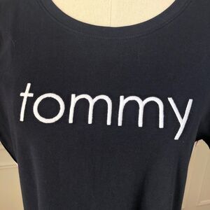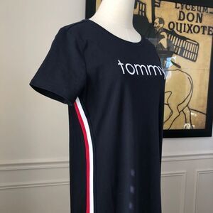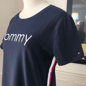 New without tags. Tommy Hilfiger T-shirt dress in Sky captain- navy blue with red and white striping down each side and white embroidered “Tommy” across the chest. Short sleeve and crew neck. Measures approximately 35 inches from shoulder to hem and 18 inches from armpit to armpit