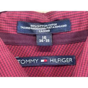 This Tommy Hilfiger tailored dress shirt features a red micro-check pattern and is made of 100% cotton with quality Hong Kong construction, a detail collectors appreciate. It includes a button-down front, single chest pocket, classic collar, and long sleeves with adjustable cuffs. The shirt is gently used with normal light wear but remains in good condition overall. Measurements shown in photos for accuracy. A great vintage-era Hilfiger piece with premium construction compared to modern versions.