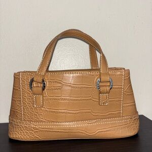 This elegant satchel by Tommy Hilfiger showcases a luxurious crocodile-embossed texture in a warm tan hue. Its structured design with dual top handles makes it a versatile choice for everyday sophistication.