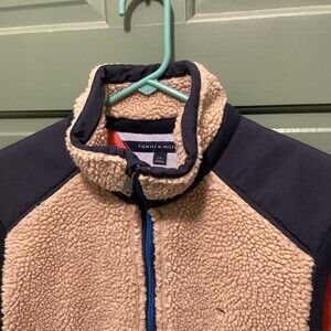 Features: Full zip - Sleeveless - Sherpa Fleece - Bright orange Mesh interior lining - Zippered Pockets - Ribbed Knit armholes - Tommy Hilfiger Small Flag Logo Embroidered on the Upper Left.