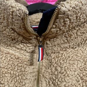 Cozy and stylish Tommy Hilfiger sherpa fleece pullover in a warm tan color. Features a 1/4 zip front, two side zip pockets, and soft plush texture for extra warmth. Perfect for layering during colder months.