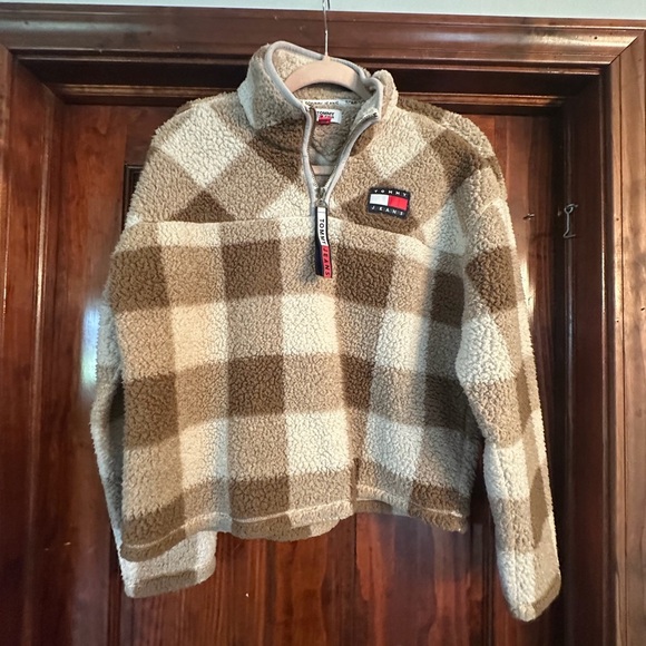 Cozy tan sherpa jacket from Tommy Hilfiger. Perfect for chilly days.