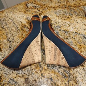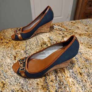 Tommy Hilfiger Tawnisha Peep Toe Canvas Cork Wedge Heels Blue Women's Sz 5.5