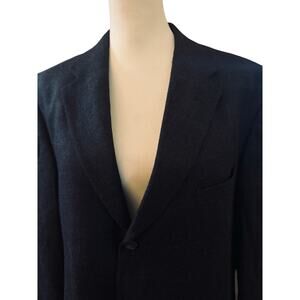Tommy Hilfiger Three Button 100% Wool Blazer, Charcoal Tweed Detail, 44 Long. 34" length. Charcoal color with a very light burgundy and blue tweed pattern. Classic notch lapels, three button front closure, one chest welt pocket, two lower front flap pockets, three interior chest pockets. Beautiful blazer, excellent condition. Made in the USA.