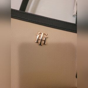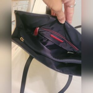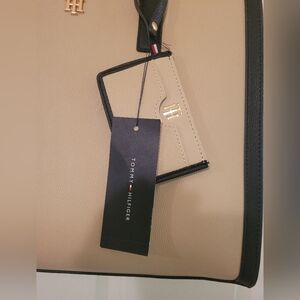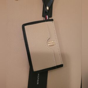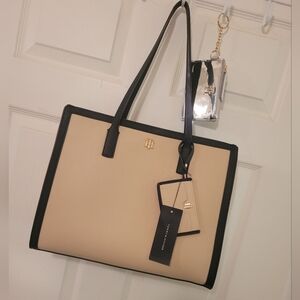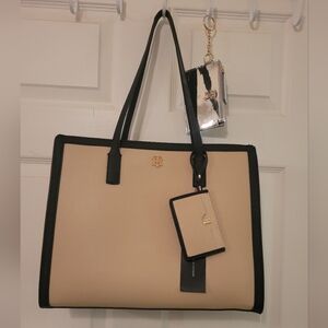 Stylish tote with a sophisticated black and cream design. Perfect for daily use. Bonus credit card holder. Has lot of space. NWT Bag 14 x 11. card holder 4 x 2, and silver card holder 5x 3. 100% polyester.
