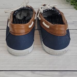 A great slip-on on casual shoe by Tommy Hilfiger with a traditional two eye lace-up closure, two-tone leather and canvas uppers, and white outsole. Good pre-owned condition with normal signs of wear.