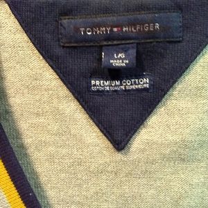 Tommy Hilfiger Sweater Men's Large V-Neck Six Button (One Extra) Cardigan Gray/ Navy/ Yellow Trim. Premium Cotton. EUC.